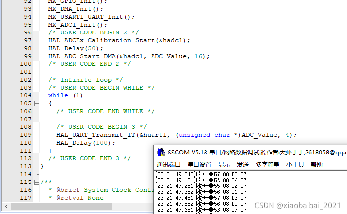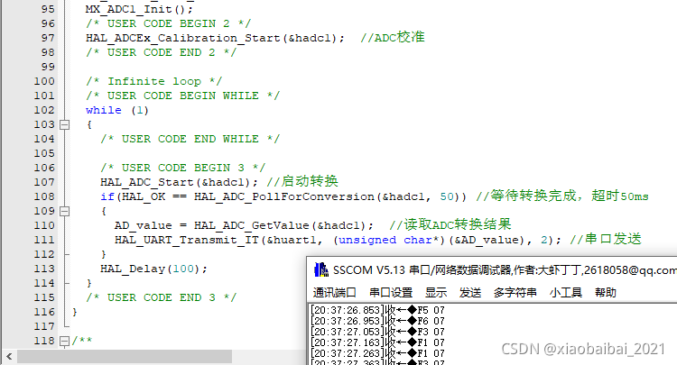 注意上面的主函数里,使用了一个100ms的延时;主要是因为stm32的ADC转换是很快的,如果不使用延时,会有大量数据通过串口上传,不方便观察。