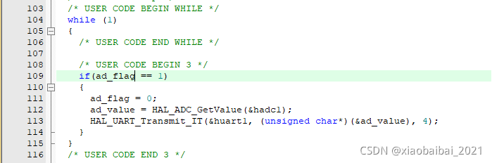 在keil中打开工程,重写ADC中断的回调函数,以指示ADC转换好: