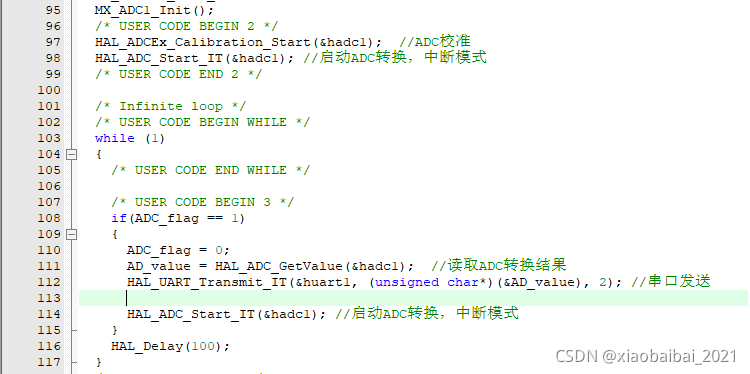 这个代码在初始化ADC之后执行一次校准(不执行这一步也可以,但精度可能会低一些);然后就可以使用ADC轮询转换了,只需要三步:启动转换、等待转换完成、读取转换数据,即可完成一次ADC转换。