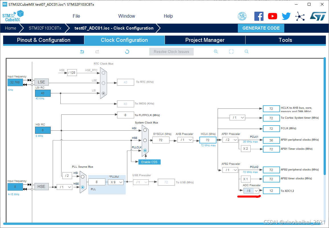 到时钟设置选项卡下,更改ADC时钟,因为我们使用的主时钟是72M,ADC的时钟不能太高,所以要分频,如下是分到12M:
