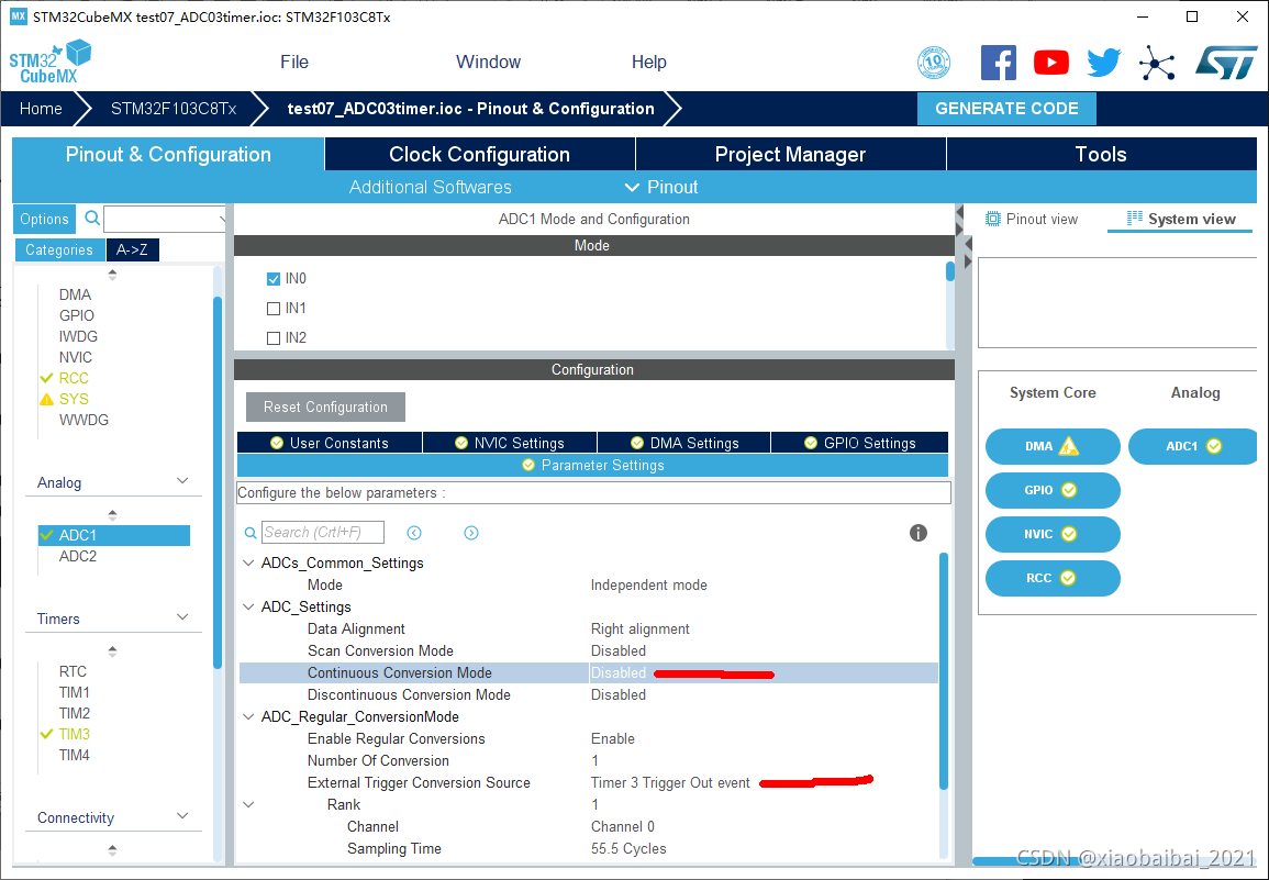 ADC的设置中,要关闭连续转换模式,并且设置为定时器触发: