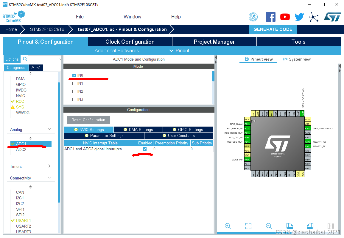 可以看到选择ADC1,勾选IN0后,右侧PA0引脚自动配置成了ADC输入;在NVIC选项卡下勾选ADC中断使能,这样我们可以在这个工程里演示轮询和中断模式。