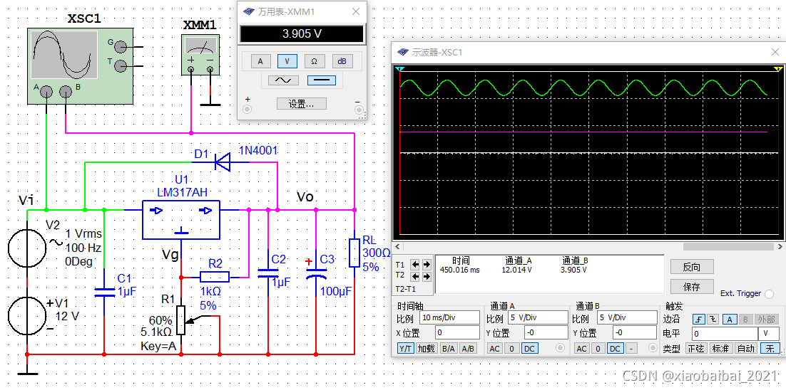 如下图所示,是线性电源LM7805的基本应用电路,可以看到,输入端加入了正弦波的波动,输出也能保持电压稳定: