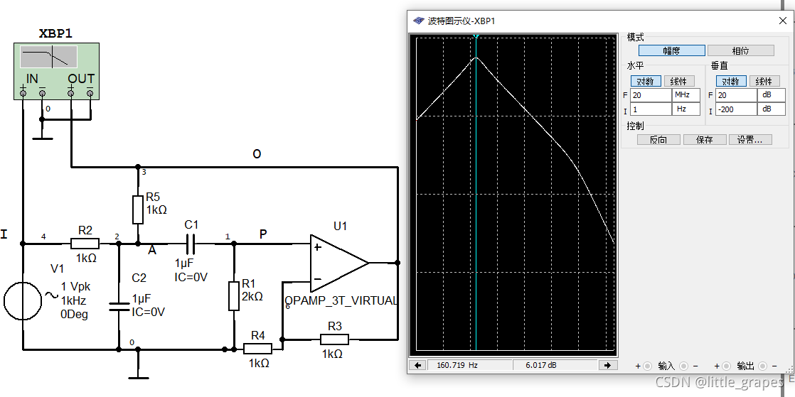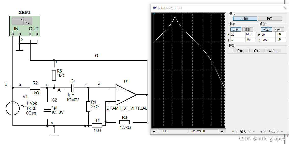 仿真图中,可以看到波特图低频区间增益很小,高频区间增益为近似定值。(图中频率特别高时,增益有下降是因为运放的带宽有限,极高频率下会衰减;所以,选用运放时要选择带宽足够能通过所有的有效信号)