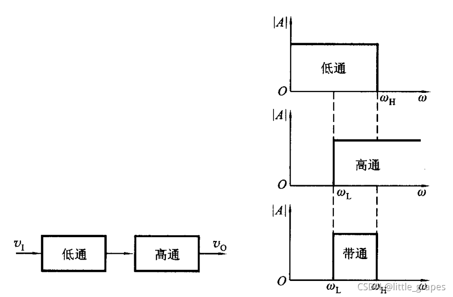 带通滤波器可以简单由低通滤波器和高通滤波器串联得到,如果低通滤波器的截止频率比高通滤波器的截止频率高,那么,处于中间频段的信号就可以通过。