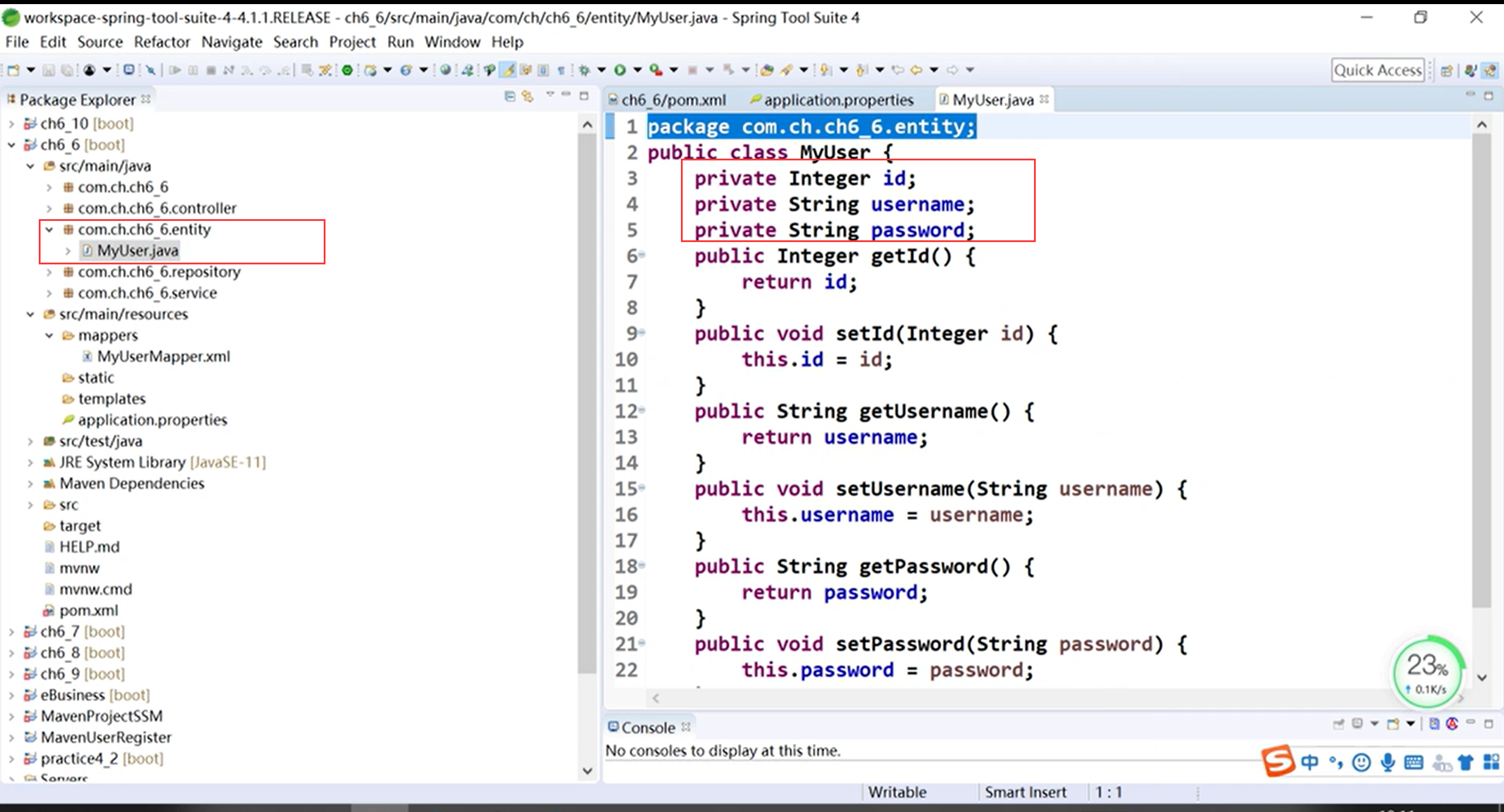 package com.ch.ch6_6.entity; public class MyUser { private Integer id; private String username; private String password; public Integer getId() { return id; } public void setId(Integer id) { this.id = id; } public String getUsername() { return username; } public void setUsername(String username) { this.username = username; } public String getPassword() { return password; } public void setPassword(String password) { this.password = password; } }