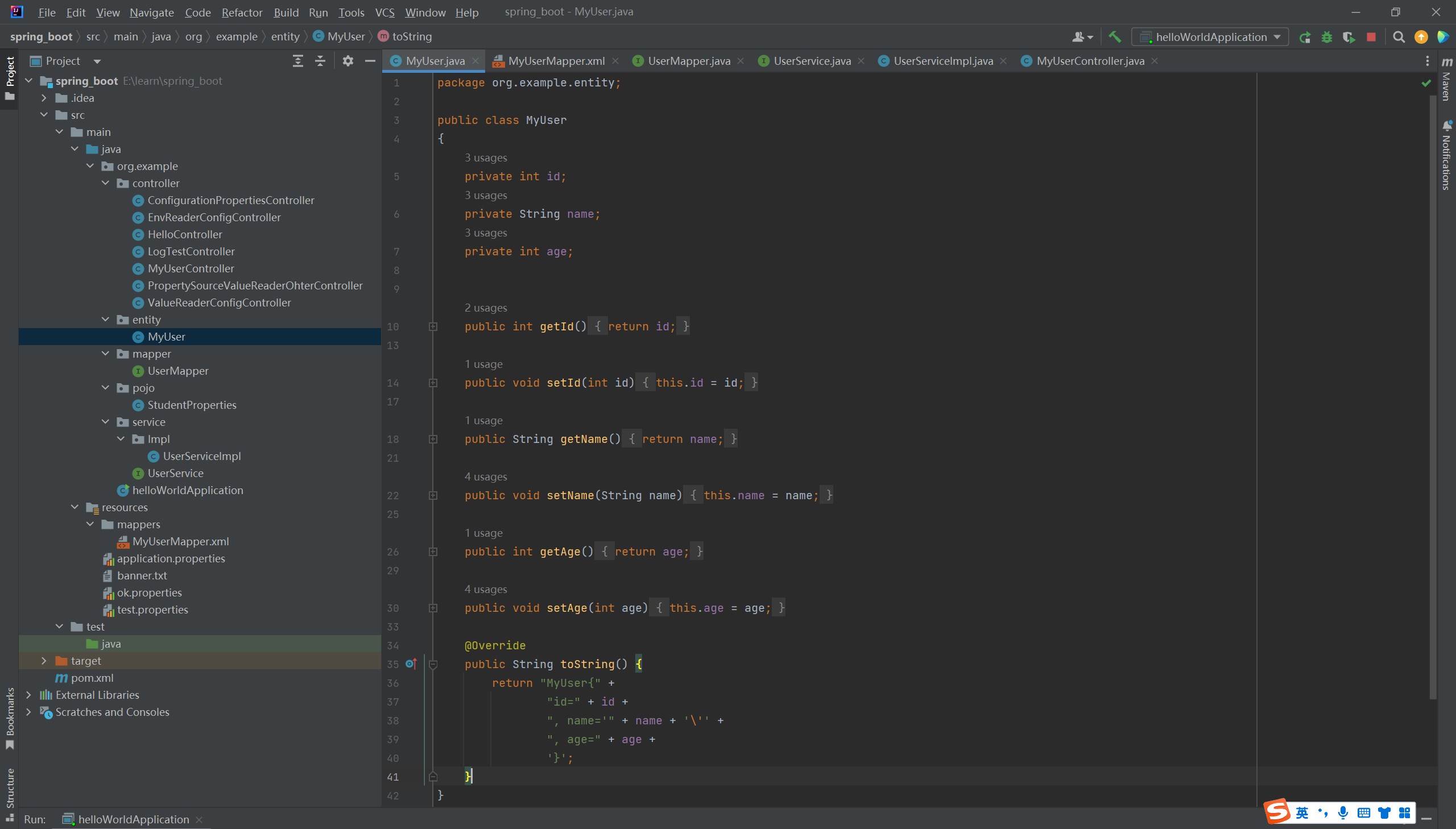 package org.example.entity; public class MyUser { private int id; private String name; private int age; public int getId() { return id; } public void setId(int id) { this.id = id; } public String getName() { return name; } public void setName(String name) { this.name = name; } public int getAge() { return age; } public void setAge(int age) { this.age = age; } @Override public String toString() { return "MyUser{" + "id=" + id + ", name='" + name + '\'' + ", age=" + age + '}'; } }