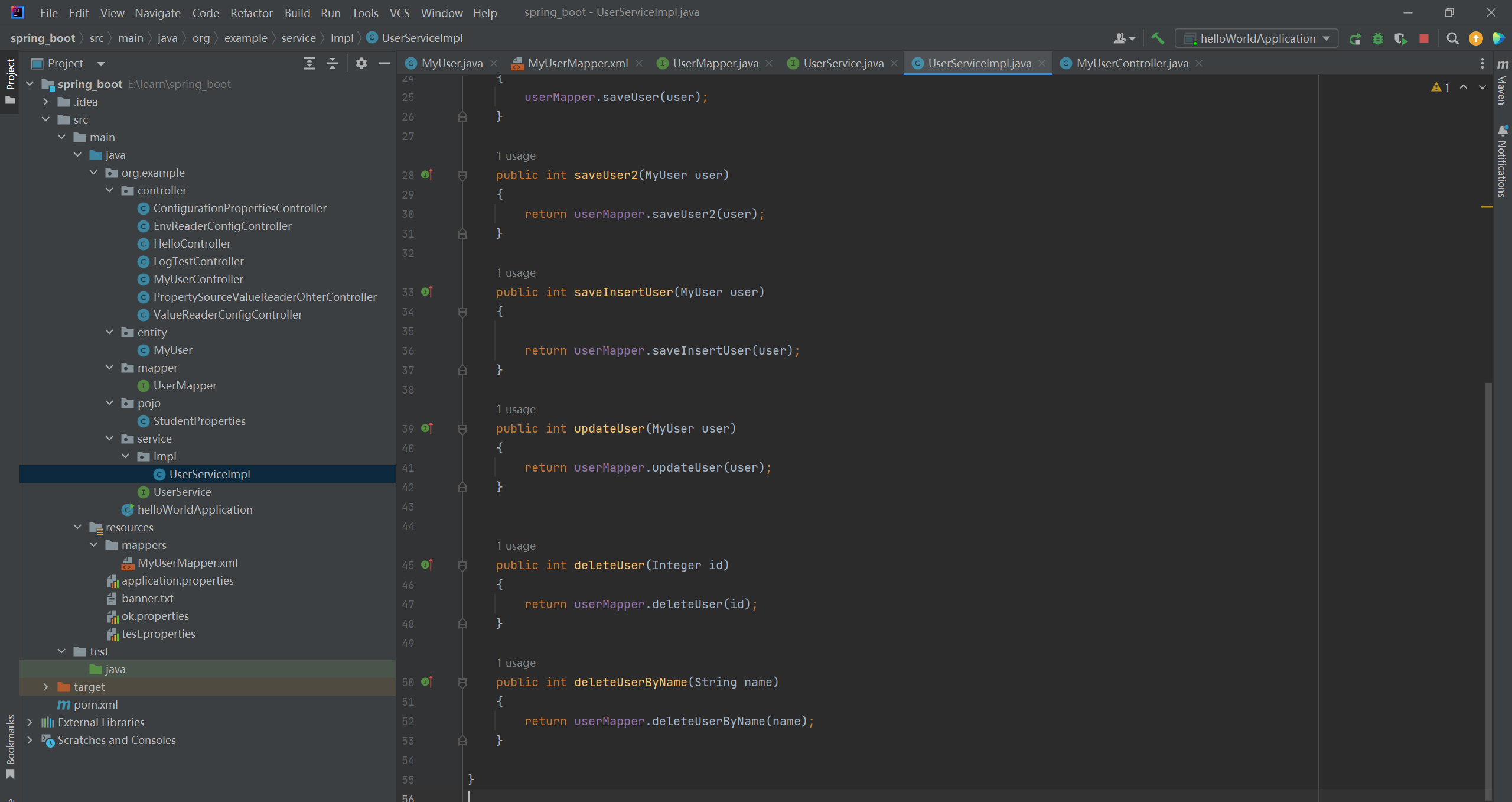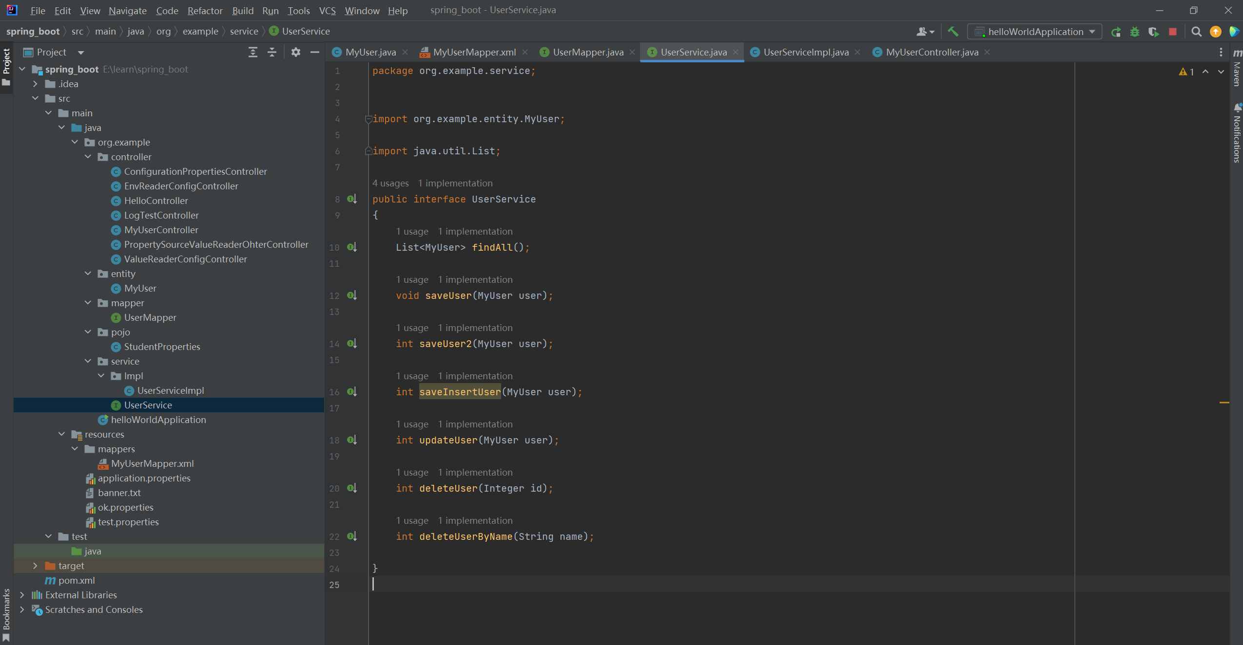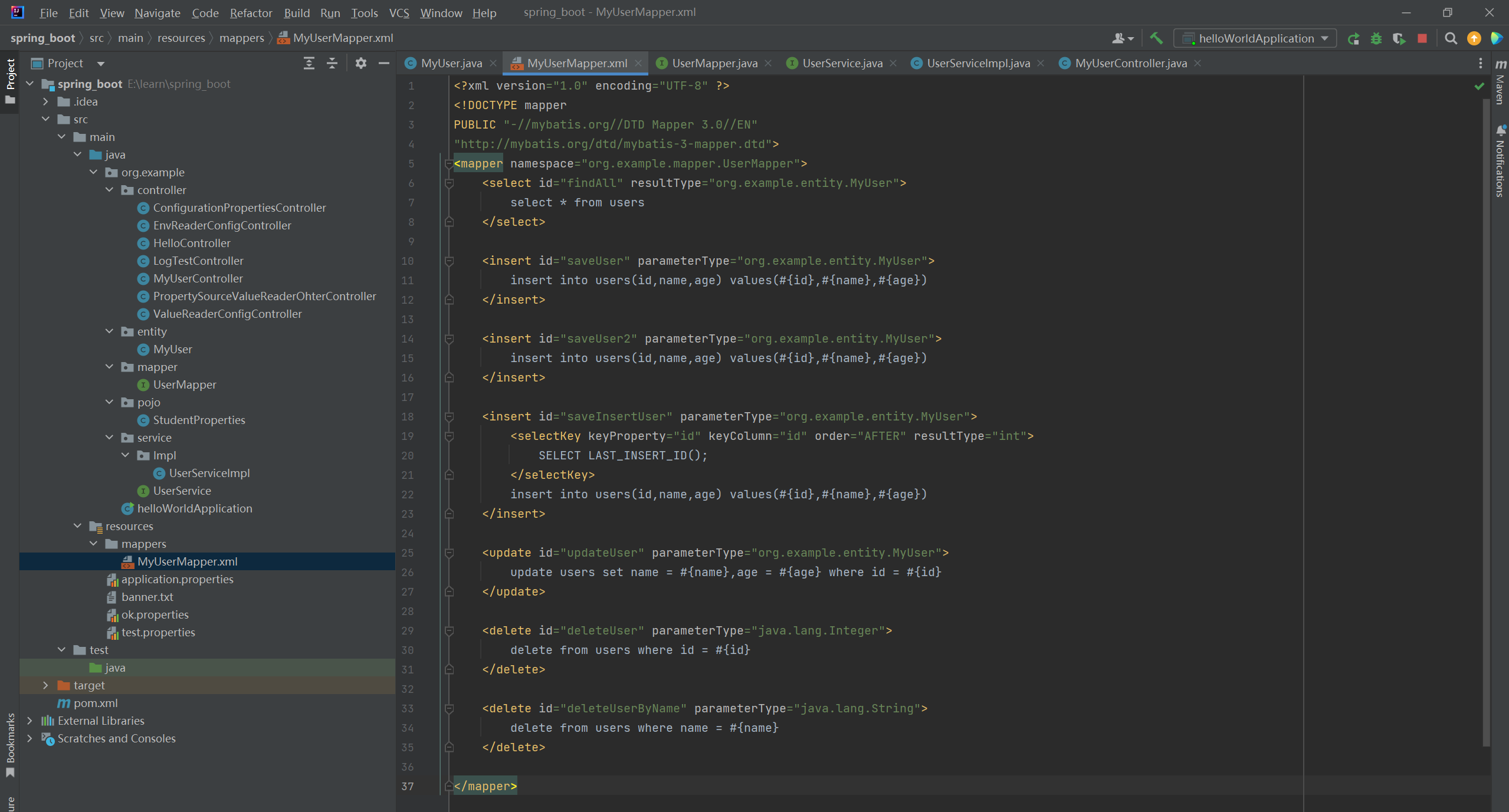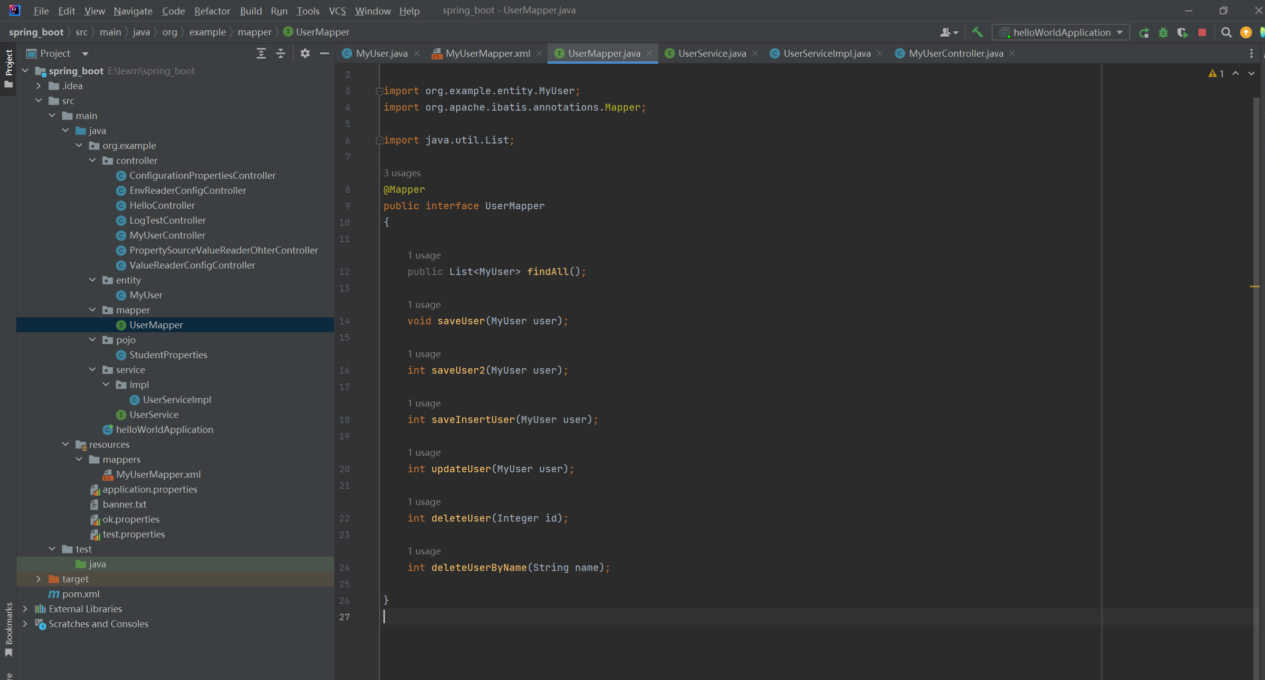 package org.example.mapper; import org.example.entity.MyUser; import org.apache.ibatis.annotations.Mapper; import java.util.List; @Mapper public interface UserMapper { public List<MyUser> findAll(); void saveUser(MyUser user); int saveUser2(MyUser user); int saveInsertUser(MyUser user); int updateUser(MyUser user); int deleteUser(Integer id); int deleteUserByName(String name); }