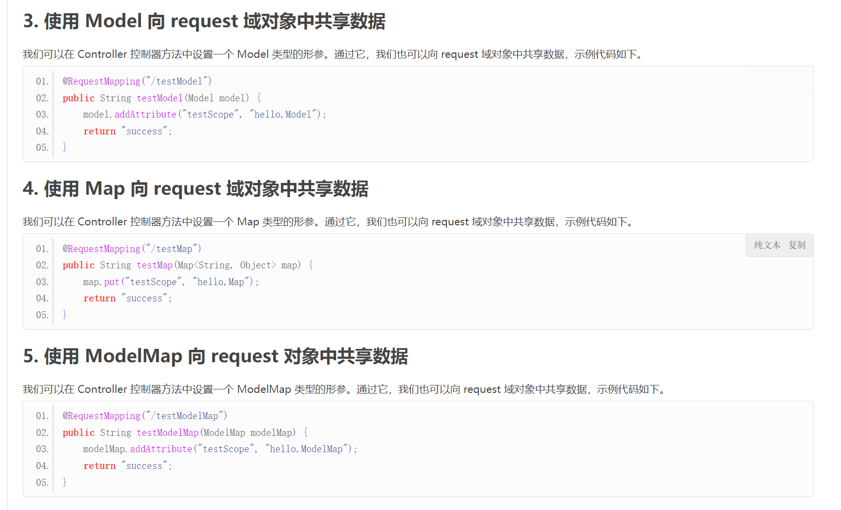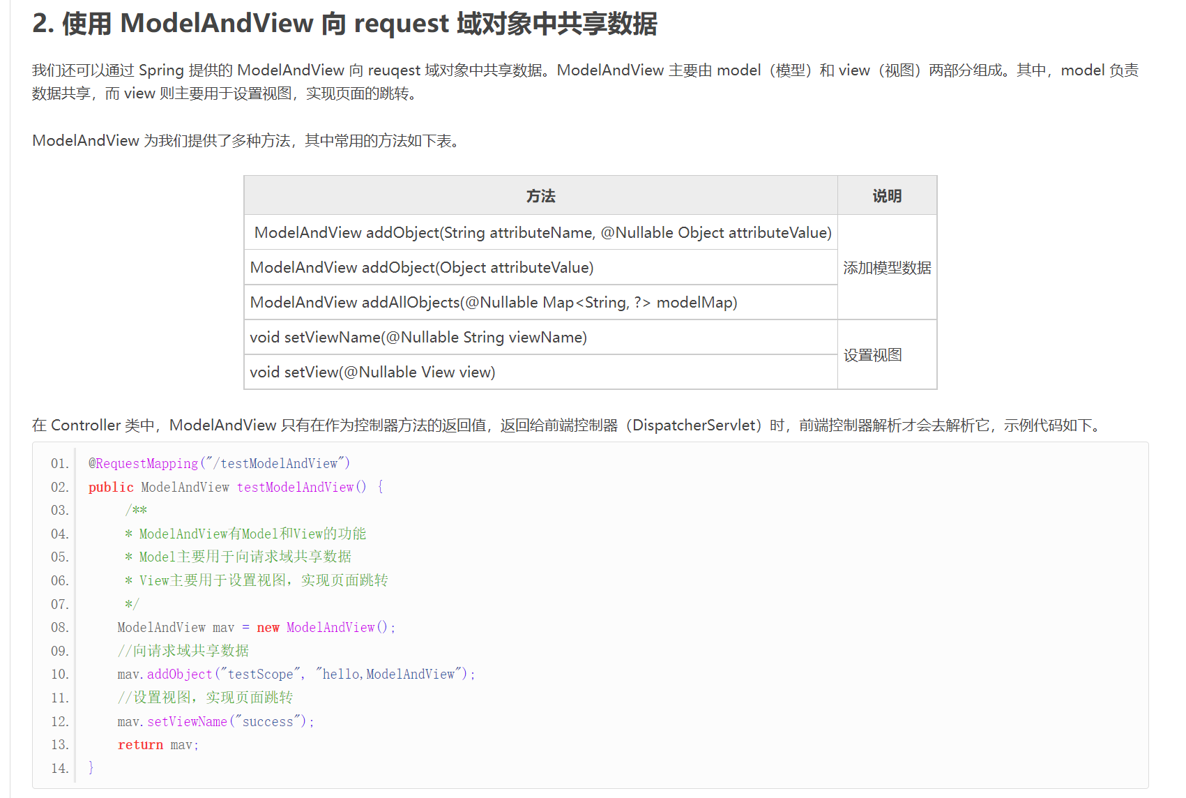 package org.example.controller.requestparam; import org.springframework.ui.Model; import org.springframework.ui.ModelMap; import org.springframework.web.bind.annotation.RequestMapping; import org.springframework.web.bind.annotation.RestController; import org.springframework.web.servlet.ModelAndView; import javax.servlet.http.HttpServletRequest; import java.util.Map; @RestController public class ShareValueController002 { /** * * *可以通过 Spring 提供的 ModelAndView 向 reuqest 域对象中共享数据。ModelAndView 主要由 model(模型)和 view(视图)两部分组成。其中,model 负责数据共享,而 view 则主要用于设置视图,实现页面的跳转。 * * 在 Controller 类中,ModelAndView 只有在作为控制器方法的返回值,返回给前端控制器(DispatcherServlet)时,前端控制器解析才会去解析它,示例代码如下。 * * @return */ @RequestMapping("/testModelAndView") public ModelAndView testModelAndView() { /** * ModelAndView有Model和View的功能 * Model主要用于向请求域共享数据 * View主要用于设置视图,实现页面跳转 */ ModelAndView mav = new ModelAndView(); //向请求域共享数据 mav.addObject("testScope", "hello,ModelAndView"); //设置视图,实现页面跳转 mav.setViewName("success"); return mav; } /** * * * *使用 Model 向 request 域对象中共享数据 *我们可以在 Controller 控制器方法中设置一个 Model 类型的形参。通过它,我们也可以向 request 域对象中共享数据,示例代码如下。 * */ @RequestMapping("/testModel") public String testModel(Model model) { model.addAttribute("testScope", "hello,Model"); return "success"; } /** * * 使用 Map 向 request 域对象中共享数据 * 我们可以在 Controller 控制器方法中设置一个 Map 类型的形参。通过它,我们也可以向 request 域对象中共享数据,示例代码如下。 * */ @RequestMapping("/testMap") public String testMap(Map<String, Object> map) { map.put("testScope", "hello,Map"); return "success"; } /** * * 使用 ModelMap 向 request 对象中共享数据 * 我们可以在 Controller 控制器方法中设置一个 ModelMap 类型的形参。通过它,我们也可以向 request 域对象中共享数据,示例代码如下。 * */ @RequestMapping("/testModelMap") public String testModelMap(ModelMap modelMap) { modelMap.addAttribute("testScope", "hello,ModelMap"); return "success"; } }