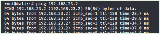 在KaliLinux系统中ping eNSP虚拟PC[192.168.23.2],显示如下: