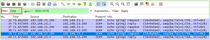 选取节点,并设置好只抓取icmp包的过滤条件,开始抓包。