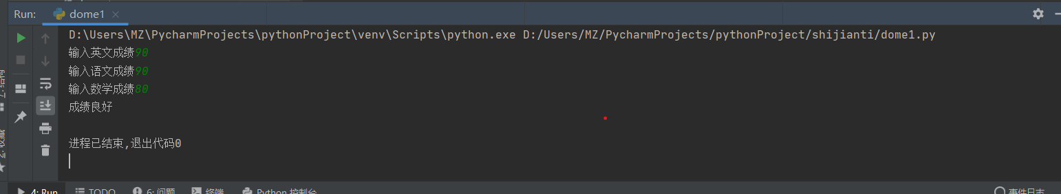 n1=int(input('输入英文成绩')) n2=int(input('输入语文成绩')) n3=int(input('输入数学成绩')) aaa=(n1+n2+n3)/3 if aaa>=90: print('成绩优秀') elif aaa>=80: print('成绩良好') elif aaa>=60: print('成绩合格') else: print('成绩不和格请回中心打印成绩单')