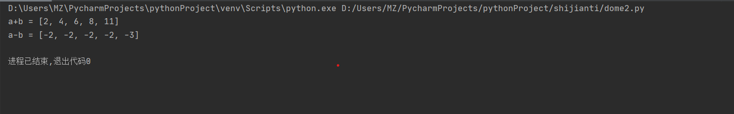 a = [0,1,2,3,4] b = [2,3,4,5,7] # 用于储存a,b数组的加减结果 r = [] re = [] i = 0 # len(数组长度) while(i < len(a)): add = a[i] + b[i] sub = a[i] - b[i] # 每次结果储存到r re里 r.append(add) re.append(sub) i = i + 1 print('a+b =',r) print('a-b =',re)