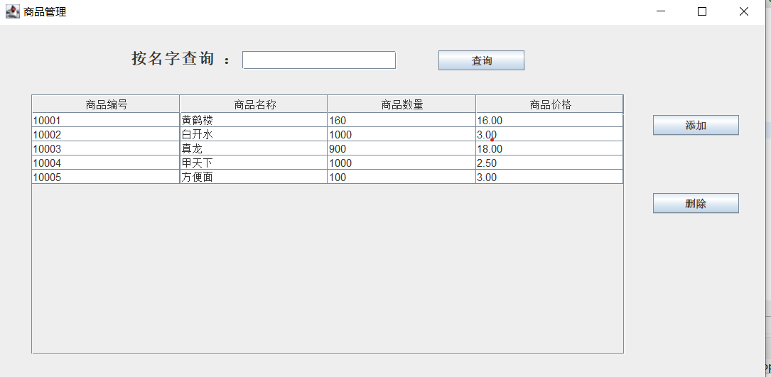 package com.kao.JDBC; import java.awt.BorderLayout; import java.awt.EventQueue; import javax.swing.JFrame; import javax.swing.JPanel; import javax.swing.border.EmptyBorder; import javax.swing.table.DefaultTableModel; import javax.swing.JLabel; import javax.swing.JOptionPane; import java.awt.Font; import javax.swing.JTextField; import javax.swing.JButton; import javax.swing.JScrollPane; import javax.swing.JTable; import java.awt.event.ActionListener; import java.sql.ResultSet; import java.sql.SQLException; import java.util.Vector; import java.awt.event.ActionEvent; public class MainFrame extends JFrame { private JPanel contentPane; private JTextField textField; private JTable table; /** * Launch the application. */ public static void main(String[] args) { EventQueue.invokeLater(new Runnable() { public void run() { try { MainFrame frame = new MainFrame(); frame.setVisible(true); } catch (Exception e) { e.printStackTrace(); } } }); } /** * Create the frame. */ public MainFrame() { setTitle("商品管理"); setDefaultCloseOperation(JFrame.EXIT_ON_CLOSE); setBounds(100, 100, 877, 436); contentPane = new JPanel(); contentPane.setBorder(new EmptyBorder(5, 5, 5, 5)); setContentPane(contentPane); contentPane.setLayout(null); JLabel lblNewLabel = new JLabel("按名字查询 :"); lblNewLabel.setFont(new Font("宋体", Font.BOLD, 18)); lblNewLabel.setBounds(148, 25, 141, 28); contentPane.add(lblNewLabel); textField = new JTextField(); textField.setBounds(274, 30, 174, 21); contentPane.add(textField); textField.setColumns(10); JButton btnNewButton = new JButton("查询"); btnNewButton.setBounds(495, 29, 97, 23); contentPane.add(btnNewButton); JScrollPane scrollPane = new JScrollPane(); scrollPane.setBounds(36, 79, 669, 293); contentPane.add(scrollPane); // 列表 // =============================查询死记=========================================== String sql = "SELECT *FROM tb_goods"; try { ResultSet data= JDBC.query(sql); Vector<Vector<String>>list=new Vector<Vector<String>>(); while(data.next()) { Vector<String> v=new Vector<String>(); v.add(data.getString(1)); v.add(data.getString(2)); v.add(data.getString(3)); v.add(data.getString(4)); list.add(v); } System.out.println(list.size()); Vector<String> ti=new Vector<String>(); ti.add("商品编号"); ti.add("商品名称"); ti.add("商品数量"); ti.add("商品价格"); table = new JTable(list,ti); scrollPane.setViewportView(table); } catch (SQLException e1) { // TODO Auto-generated catch block e1.printStackTrace(); } // ============================================================================ // 这个可和查列表混合写,不过我这样更容易理解 // =============================分开写这查寻获取要放在显示界面的数据的下面写好上面Cv就好==================================================== // =====================查询某个民字记得这个这两句就好 btnNewButton.addActionListener(new ActionListener() { public void actionPerformed(ActionEvent e) { String a=textField.getText(); String sql ="SELECT sum(num) FROM tb_goods WHERE goodName LIKE '%"+a+"%'"; // ==================================================================== try { ResultSet data= JDBC.query(sql); Vector<Vector<String>>list=new Vector<Vector<String>>(); while(data.next()) { Vector<String> v=new Vector<String>(); v.add(data.getString(1)); // v.add(data.getString(2)); // v.add(data.getString(3)); // v.add(data.getString(4)); list.add(v); } System.out.println(list.size()); Vector<String> ti=new Vector<String>(); ti.add("商品编号"); // ti.add("商品名称"); // ti.add("商品数量"); // ti.add("商品价格"); table = new JTable(list,ti); scrollPane.setViewportView(table); } catch (SQLException e1) { // TODO Auto-generated catch block e1.printStackTrace(); } } }); // ====================================================================================== JButton btnNewButton_1 = new JButton("添加"); btnNewButton_1.addActionListener(new ActionListener() { public void actionPerformed(ActionEvent e) { MainFrameADD aa=new MainFrameADD(); aa.setVisible(true); // } }); btnNewButton_1.setBounds(736, 102, 97, 23); contentPane.add(btnNewButton_1); JButton btnNewButton_2 = new JButton("删除"); btnNewButton_2.addActionListener(new ActionListener() { public void actionPerformed(ActionEvent e) { // ======这句话是获取他的相对位置====就是在列表上重零开始建议记我的==== // int hang=table.getSelectedRow(); // System.out.println(hang); // ==================我的这句话是获取你列表点中选择的行的第0个值======= int hang = Integer.parseInt(table.getValueAt(table.getSelectedRow(), 0).toString()); System.out.println(hang); if(hang==-1) { JOptionPane.showMessageDialog(null, "你还未选中要删除行"); }else { String sql="DELETE FROM tb_goods WHERE goodId="+hang; try { boolean aas =JDBC.updete(sql,null); if(aas==true) { JOptionPane.showMessageDialog(null, "删除成功"); }else { JOptionPane.showMessageDialog(null, "删除失败"); } } catch (SQLException e1) { // TODO Auto-generated catch block e1.printStackTrace(); } } } }); btnNewButton_2.setBounds(736, 190, 97, 23); contentPane.add(btnNewButton_2); } public void get(String sql) { } }