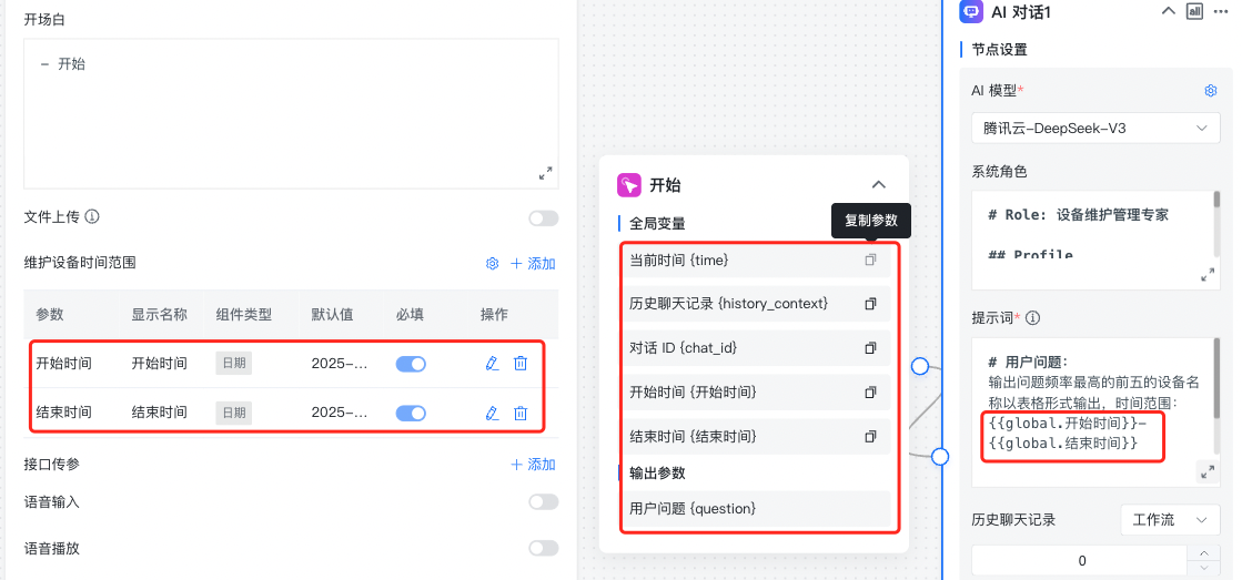 如下图所示:开始节点中包含诸多全局参数,包括的文件上传、用户输入参数以及借口传参等,均可作为提示词。
