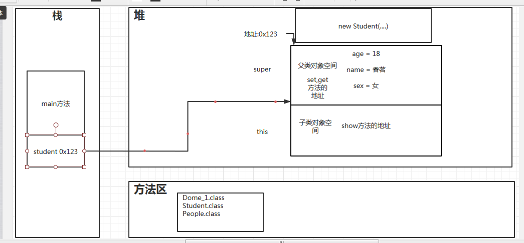 public class Dome_1 { public static void main(String[] args) { // TODO Auto-generated method stub Student student = new Student(18,"香茗","女"); student.show(); } } class Student extends People{ public Student(int age,String name,String sex) { super(age,name,sex); } public void show() { System.out.printf("学生信息:age:%d\tname:%s\tsex:%s\n",getAge(),getName(),getSex()); } } class People{ private int age; private String name; private String sex; public People(int age,String name,String sex) { this.age = age; this.name = name; this.sex = sex; } public void setAge(int age) { this.age = age; } public int getAge() { return this.age; } public void setName(String name) { this.name = name; } public String getName() { return this.name; } public void setSex(String sex) { this.sex = sex; } public String getSex() { return this.sex; } }