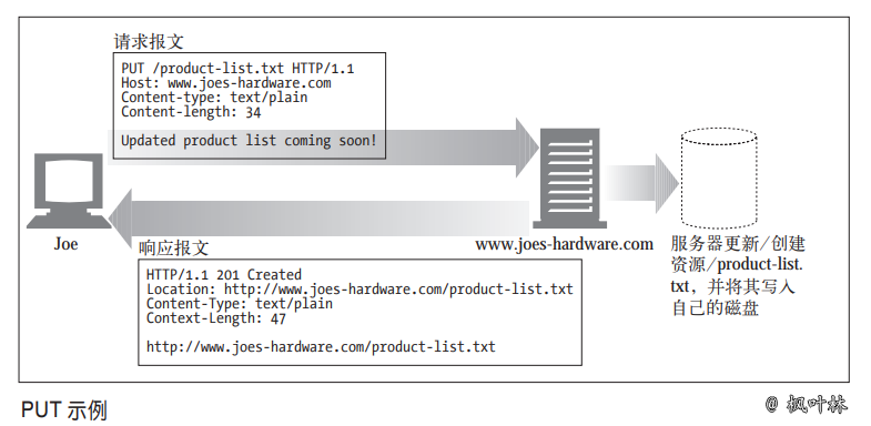 与 GET 从服务器读取文档相反,PUT 方法会向服务器写入文档。有些发布系统允许用户创建 Web 页面,并用 PUT 直接将其安装到 Web 服务器上去