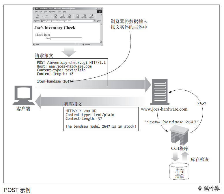 POST 方法起初是用来向服务器输入数据的。实际上,通常会用它来支持 HTML 的表单。表单中填好的数据通常会被送给服务器,然后由服务器将其发送到它要去的地方(比如,送到一个服务器网关程序中,然后由这个程序对其进行处理)