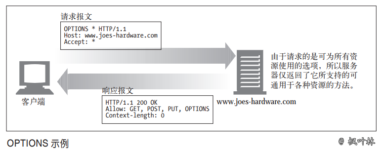 OPTIONS 方法请求 Web 服务器告知其支持的各种功能。可以询问服务器通常支持哪些方法,或者对某些特殊资源支持哪些方法。(有些服务器可能只支持对一些特殊类型的对象使用特定的操作)