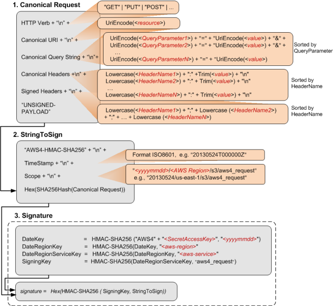 AWS4-HMAC-SHA256、时间戳、Scop,再打一个包,叫StringToSign。 -