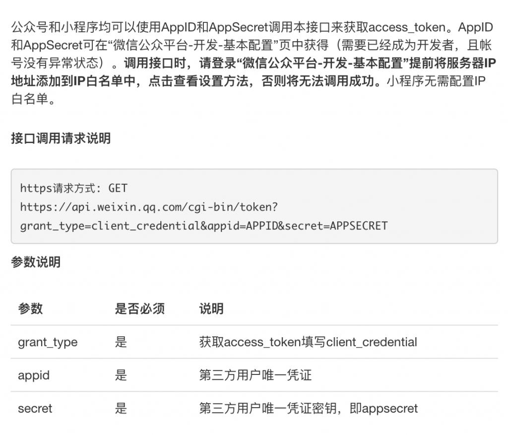 这里,容我多扯一句,微信公从平台的开发文档中,使用了OAuth 2.0 的 Client Credentials的方式(参看文档“微信公众号获取access token”),我截了个图如下所谓。我们可以看到,微信公众号使用的是GET方式的请求,把AppID和AppSecret放在了URL中,虽然这也符合OAuth 2.0,但是并不好,因为大多数网关代理会把整个URI请求记到日志中。我们只要脑补一下腾讯的网关的Access Log,里面的日志一定会有很多的各个用户的AppID和AppSecret……