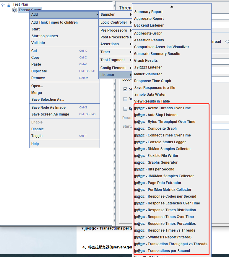 下载完毕后,把上面两个jar包放到D:\Jmeter\apache-jmeter-5.2.1\lib\ext下,然后启动JMeter就可以看到以下监听器了,然后添加需要的监听器即可。下面是常用插件: