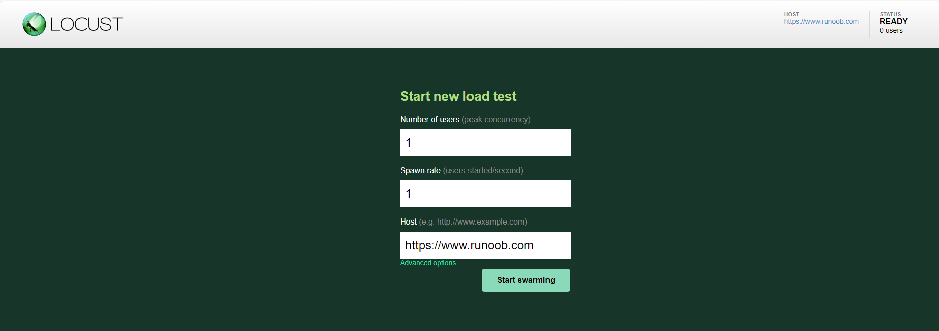 其中,Number of users:用户并发数;Spawn rate:每秒钟启动多少并发;Host:进行测试的地址。
