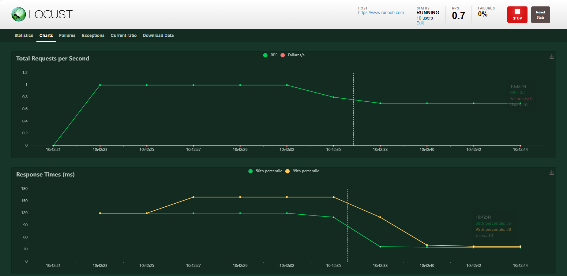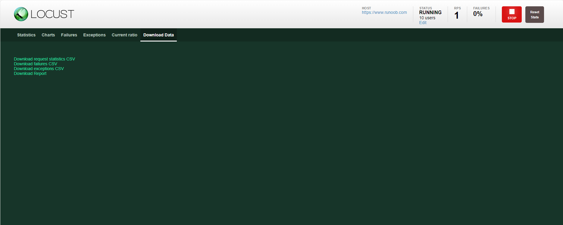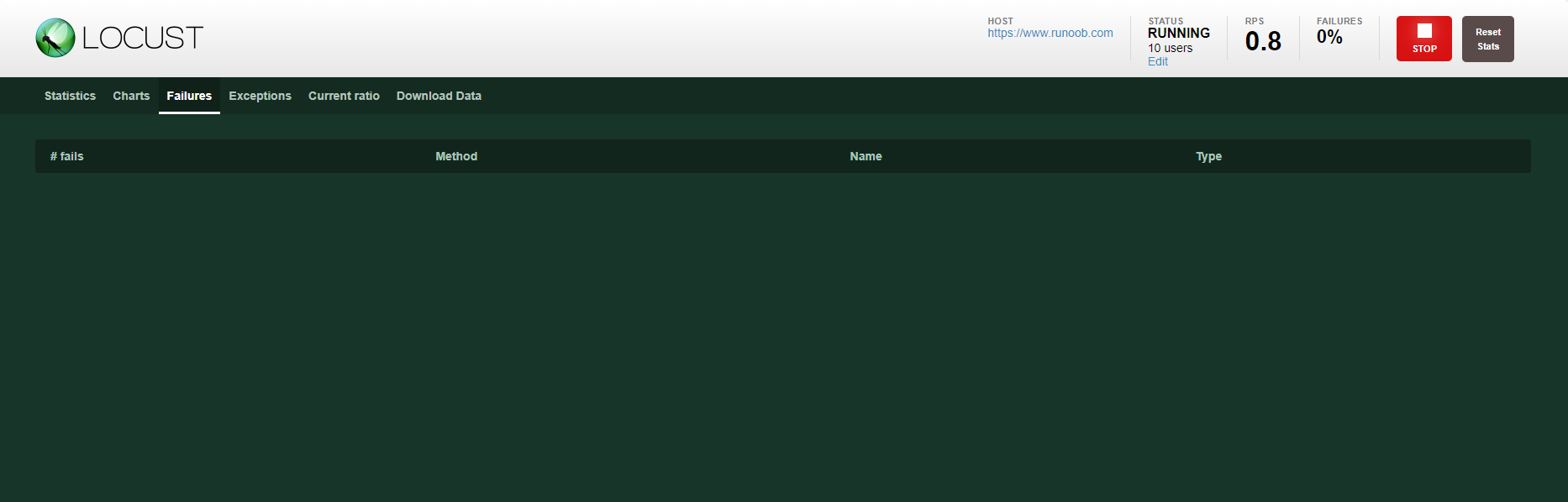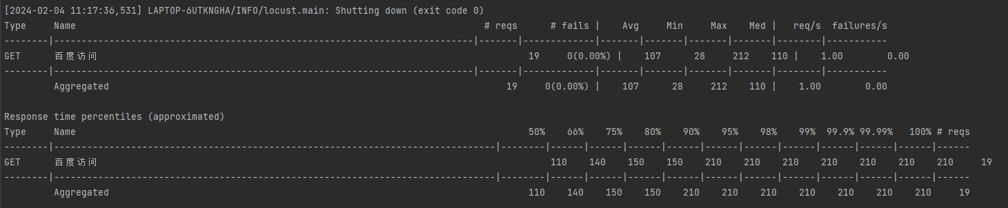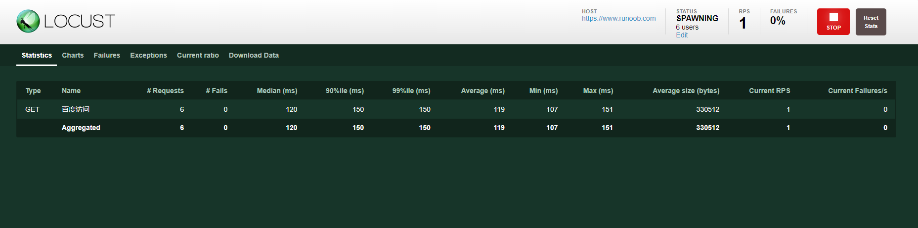 AppleWebKit/537.36 (KHTML, like Gecko) Chrome/119.0.0.0 Safari/537.36'} url = '/' # 请求路径,除了主机地址后面的请求路径,主机地址可以在用户类里定义 # catch_response:为了使用response.success()与response.failure()这两个函数 # name:相当于为mytask_01对应的请求起了一个别名,用于在运行结果中的name列显示,方便阅读 with self.client.get(url=url,headers=headers,catch_response=True,name='百度访问') as response: if response.status_code == 200: response.success() else: response.failure('百度访问失败') class WebUser(HttpUser): """性能参数配置,继承用户配置类""" host = 'https://www.runoob.com' tasks = [WebBehaviour,] wait_time = between (3,25) # min_wait = 1000 ms # max_wait = 3000 ms if __name__ == '__main__': file_path = os.path.abspath(__file__) os.system(f"locust -f {file_path} --host=https://www.baidu.com -P=8088 --headless -u 10 -r 3 -t 20s")