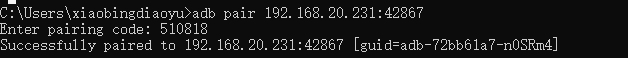 4)在命令行窗口输入:adb pair ip:port,回车,输入配对码;