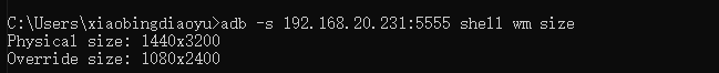 2)获取手机屏幕分辨率,adb -s 192.168.20.231:5555 shell wm size,我们需要的是Override对应的值;