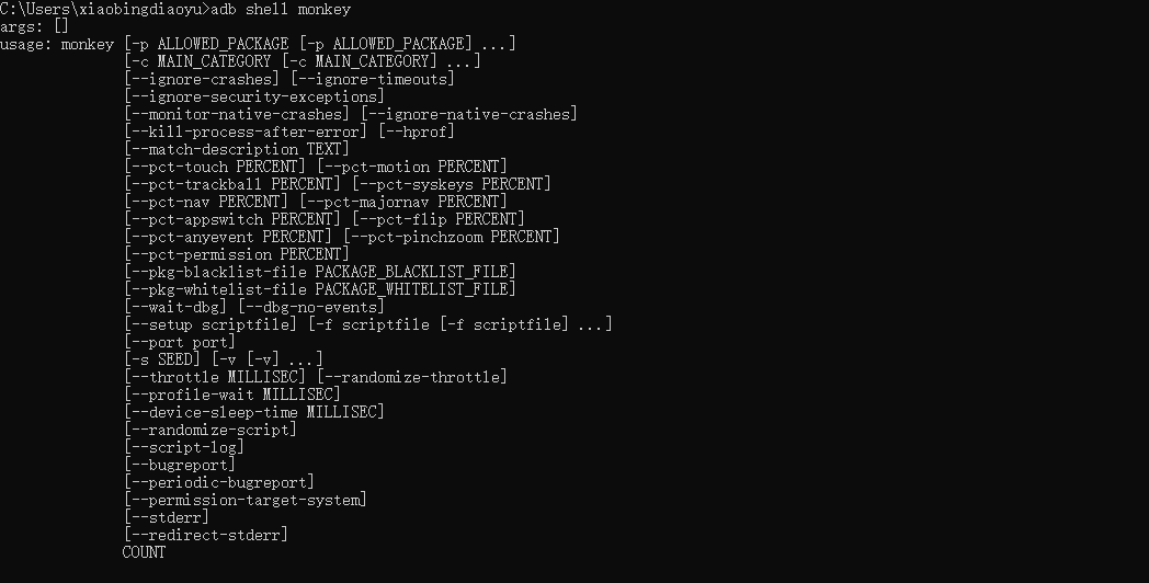 --pct-touch,指定操作事件,以触摸事件为例,其他操作事件,可以通过在命令行窗口输入:adb shell monkey,进行查看。