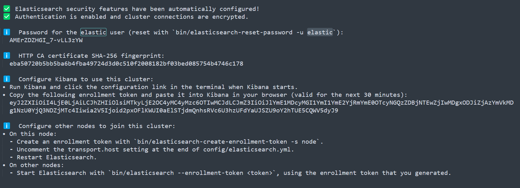 执行后,会启动单机版的单节点ES服务。因为ES在8.x版本中默认开启认证,因此启动时会自动初始化elastic用户的密码、证书以及配置文件。