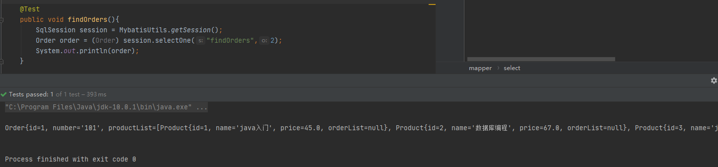 1 <?xml version="1.0" encoding="UTF-8"?> 2 <!DOCTYPE mapper 3 PUBLIC "-//mybatis.org//DTD mapper 3.0//EN" 4 "http://mybatis.org/dtd/mybatis-3-mapper.dtd"> 5 <mapper namespace="com.xiaobiti.pojo.Order"> 6 <select id="findOrders" parameterType="Integer" resultMap="orderResult"> 7 SELECT o.*,p.id as product_id,p.name,p.price FROM tb_order o,tb_product p,orderitem oi where o.id = oi.order_id AND p.id = oi.product_id AND o.id = 1 8 </select> 9 <resultMap id="orderResult" type="com.xiaobiti.pojo.Order"> 10 <id property="id" column="id"/> 11 <result property="number" column="number"/> 12 <collection property="productList" ofType="com.xiaobiti.pojo.Product"> 13 <id property="id" column="product_id"/><!-- product表中id别名改为product_id,所以这里的column对应product_id --> 14 <result property="name" column="name"/> 15 <result property="price" column="price"/> 16 </collection> 17 </resultMap> 18 </mapper>