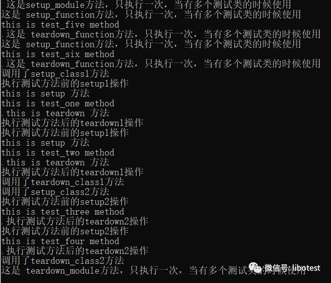 在一个test开头的py文件里面,编写一下脚本:def setup_module():print('\n 这是setup_module方法,只执行一次,当有多个测试类的时候使用')def teardown_module():print('这是 teardown_module方法,只执行一次,当有多个测试类的时候使用')def teardown_module():print('这是 teardown_module方法,只执行一次,当有多个测试类的时候使用')def setup_function():print('这是 setup_function方法,只执行一次,当有多个测试类的时候使用')def teardown_function():print('这是 teardown_function方法,只执行一次,当有多个测试类的时候使用')def test_five():print('this is test_five method')def test_six():print('this is test_six method')class TestPytest01:def setup_class(self):print('调用了setup_class1方法')def teardown_class(self):print('调用了teardown_class1方法')def setup_method(self):print('执行测试方法前的setup1操作')def teardown_method(self):print('执行测试方法后的teardown1操作')def test_one(self):print('this is test_one method')def test_two(self):print('this is test_two method')def setup(self):print('this is setup 方法')def teardown(self):print('this is teardown 方法')class TestPytest02:def setup_class(self):print('调用了setup_class2方法')def teardown_class(self):print('调用了teardown_class2方法')def setup_method(self):print('执行测试方法前的setup2操作')def teardown_method(self):print('执行测试方法后的teardown2操作')def test_three(self):print('this is test_three method')def test_four(self):print('this is test_four method')