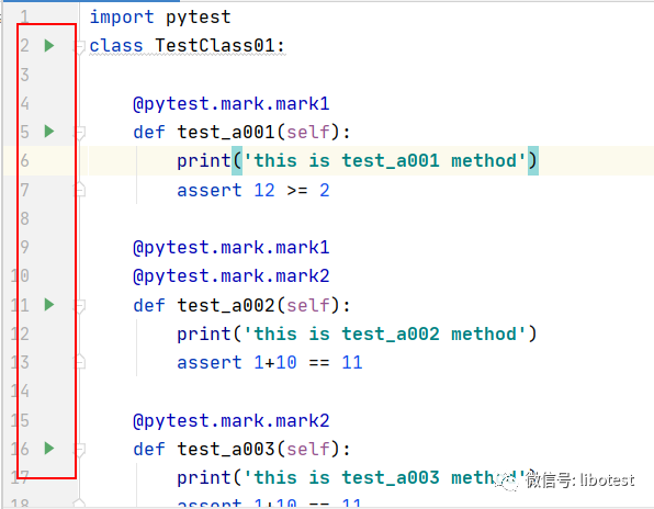 (需要安装pytest依赖,然后符合编写规则的测试用例都能被pycharm识别出来,会在用例前面出现一个绿色的执行按钮,点击这个按钮就能执行某个方法或者某个类)