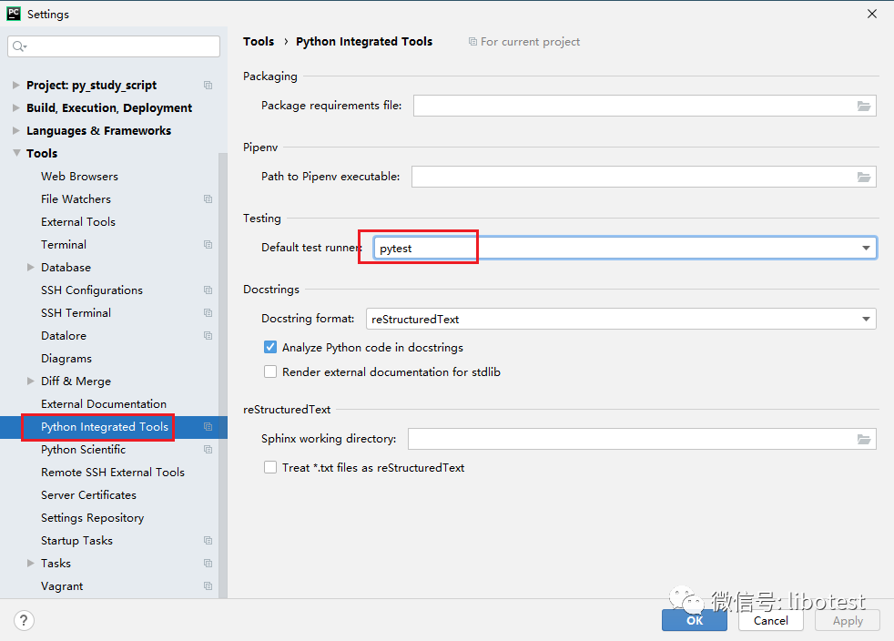 1、先打开Pycharm设置->Tools->Python Integrated Tools->Testing:pytest