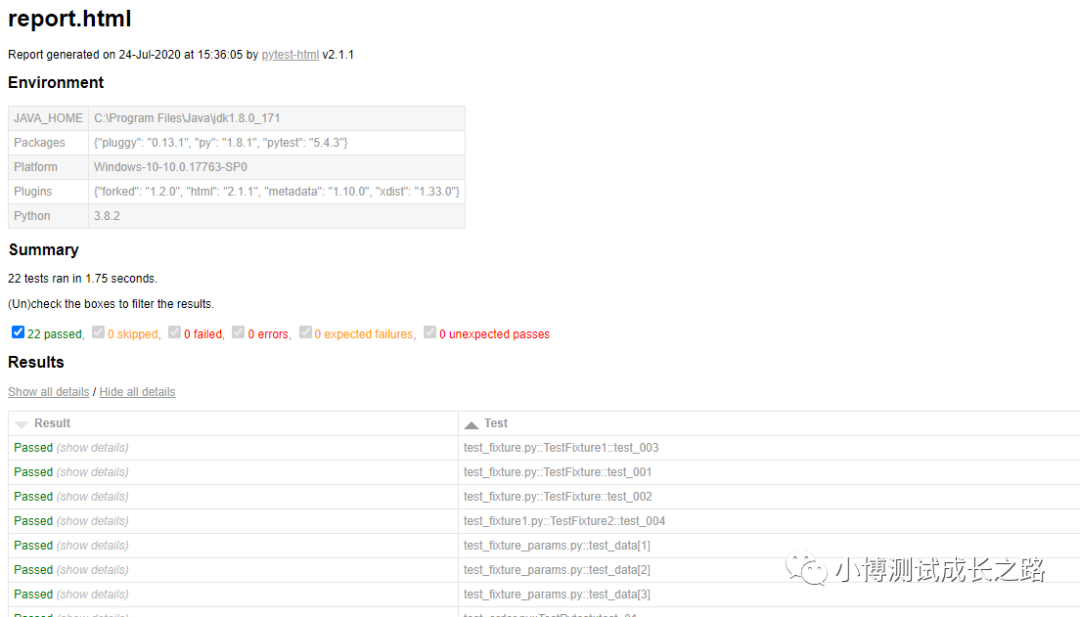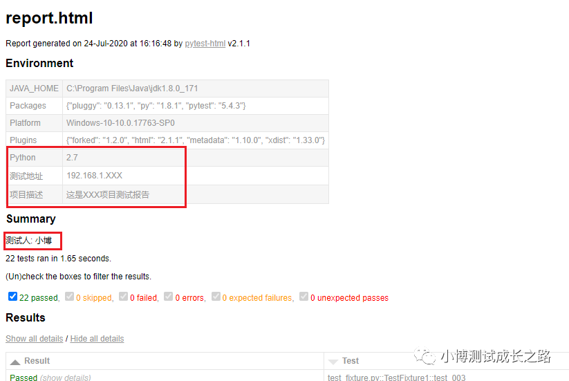 import pytestfrom py._xmlgen import html# Environment下添加配置项或者修改已有配置项d的值def pytest_configure(config):config._metadata['测试地址'] = '192.168.1.XXX'config._metadata['项目描述'] = '这是XXX项目测试报告'config._metadata['Python'] = '2.7' #报告中默认会有python版本,可以自己手动修改# Summary下添加个性化的内容展示@pytest.mark.optionalhookdef pytest_html_results_summary(prefix, summary, postfix):prefix.extend([html.p("测试人: 小博")])