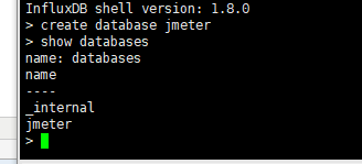 create database jmeter创建名为jmeter的数据库,show databases命令查看数据库创建成功
