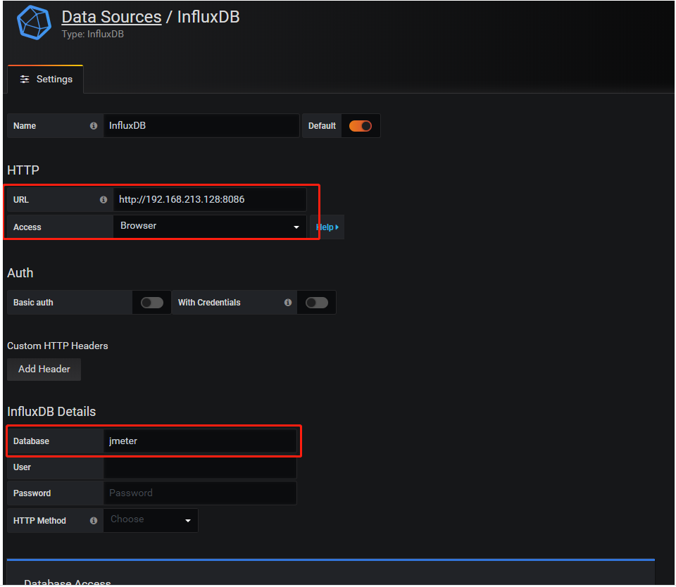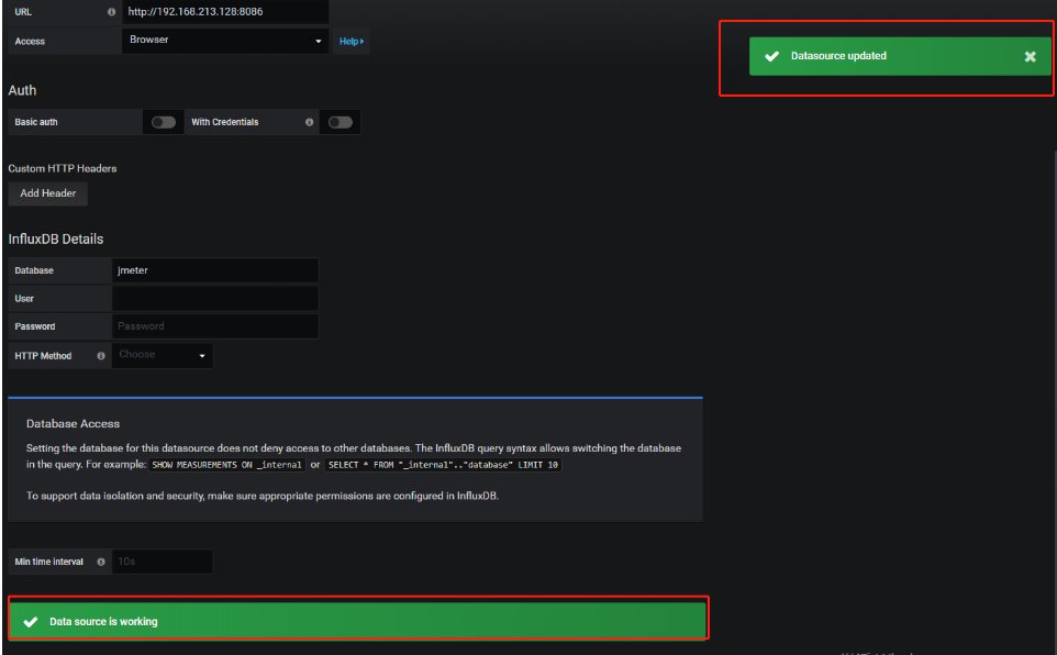 influxdbUrl:需要改为自己influxdb的部署ip和映射端口,端口是容器启动时映射的8086端口,db后面跟的是刚才创建的数据库名称