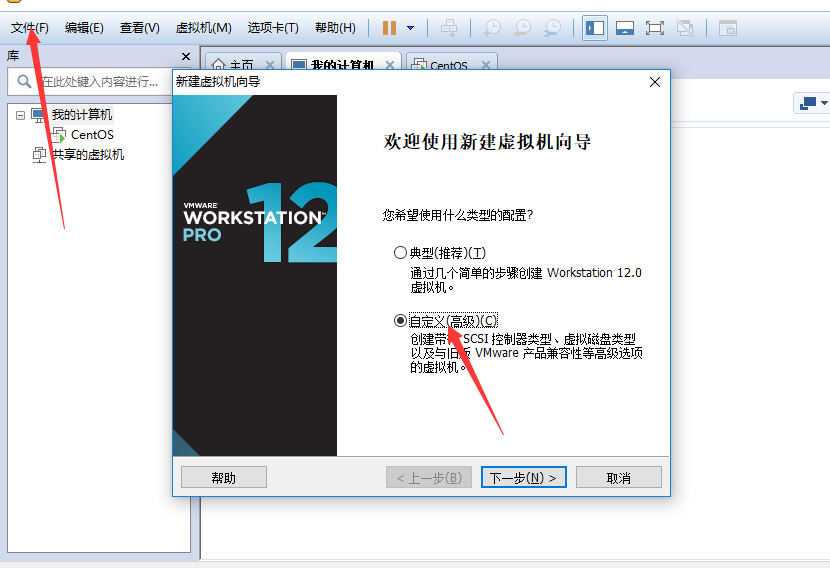 1.点击文件,选择新建虚拟机,选择自定义安装,点击下一步