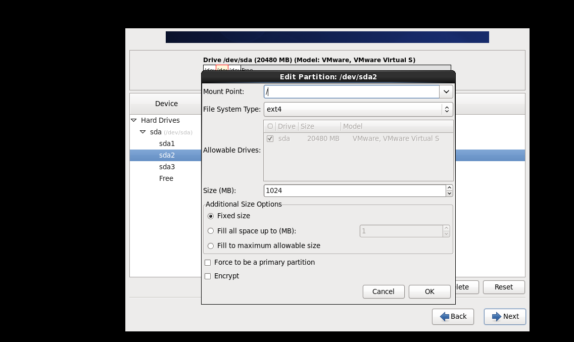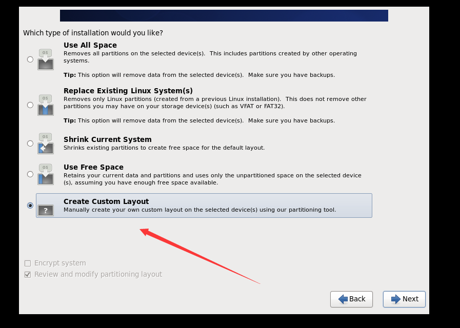 24.分区咱们使用自定义(这里如果不知道的内存是多大,可以按ctrl+alt+F2,切换至命令行,键入命令:cat /proc/meminfo可查看内存情况)