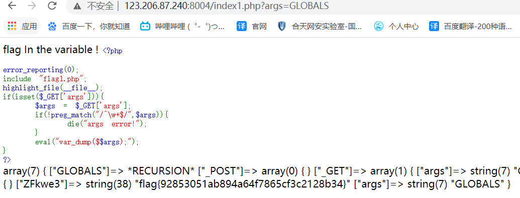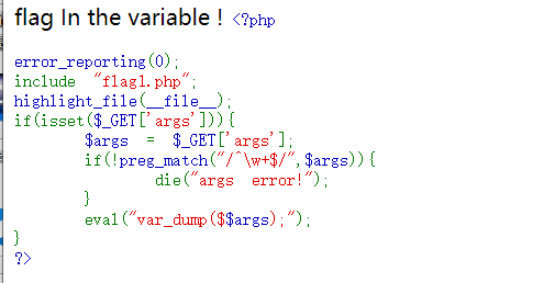 if(!preg_match("/^\w+$/",$args)){ //preg_match匹配引号里的与变量$args对比,**不匹配的时候则会输出die也就是说当变量存在这些匹配字符则会die语句**,匹配会执行eval