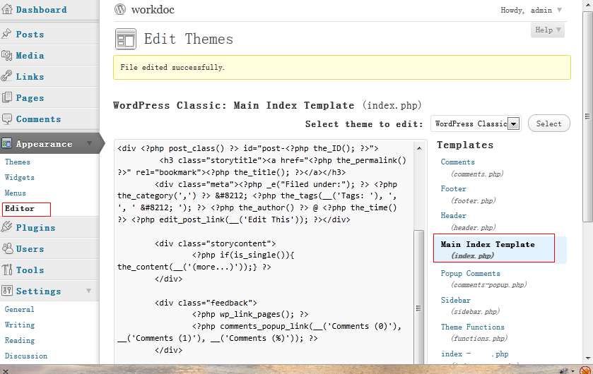 2. 再点击 右下角的 主题模板 index.php 文件,进入修改状态,