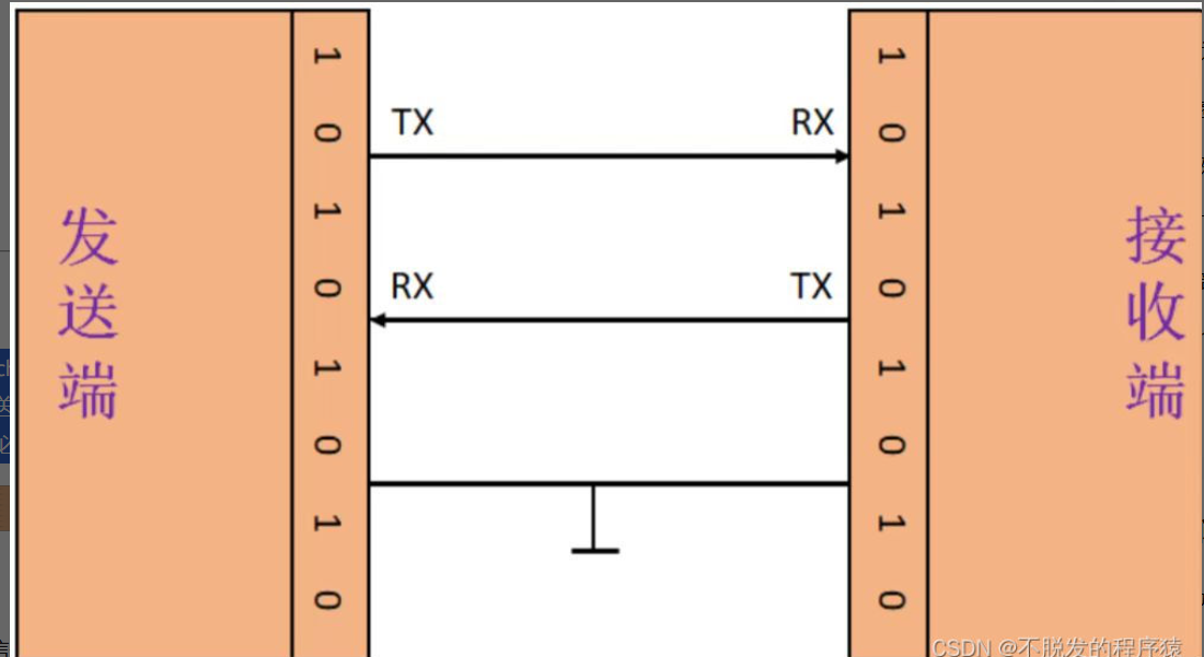 UART是一种双向、串行、异步的通信总线,仅用一根数据接收线和一根数据发送线就能实现全双工通信。典型的串口通信使用3根线完成,分别是:发送线(TX)、接收线(RX)和地线(GND)物理层,通信时必须将双方的TX和RX交叉连接并且GND相连才可正常通信,如下图所示: