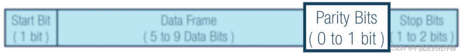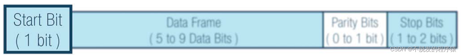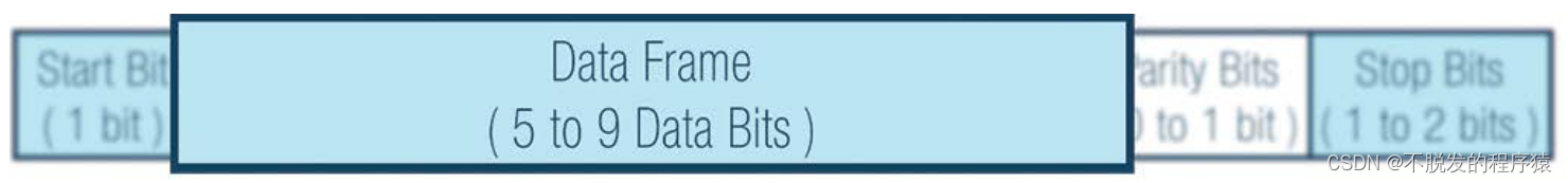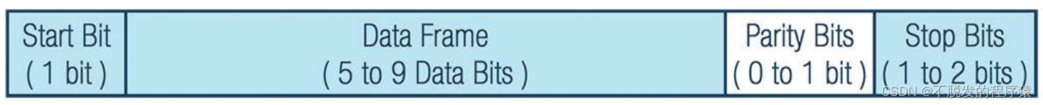 在uart中,传输模式为数据包形式。数据包由1位起始位、5到9位数据帧、1位奇偶校验位和1到2位停止位组成。如下图所示