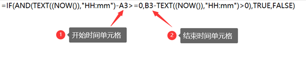 =IF(AND(TEXT((NOW()),"HH:mm")-开始时间单元格>=0,结束时间单元格-TEXT((NOW()),"HH:mm")>0),TRUE,FALSE)