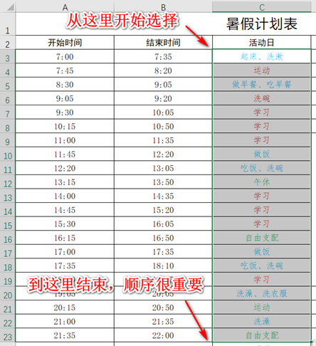 从图中活动日的第一行开始往下选择,至最后一行(从上往下选择),选择顺序很重要哦