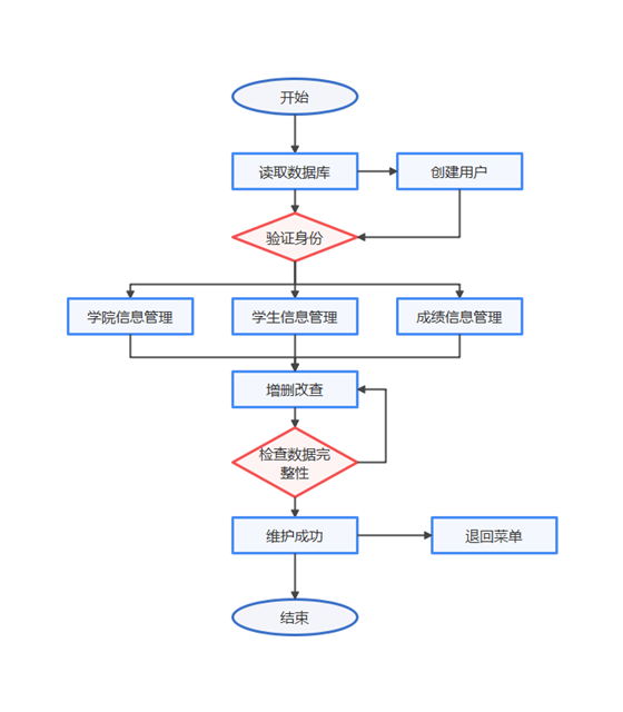 系统主要以CRUD操作为主,每次执行增加操作时,需要检测数据库中是否已经存在;删除操作时,需要查询数据库中是否已有相应的数据;改修数据时既需要判断用户输入的数据是否存在,也需要判断修改后的数据是否符合条件;查询时,直接按行读取数据库中的数据,而后显示即可,但查询成绩时,需要对数据进行排序而后输出前三名或总分前五名。下面是具体的流程图: