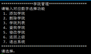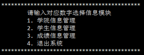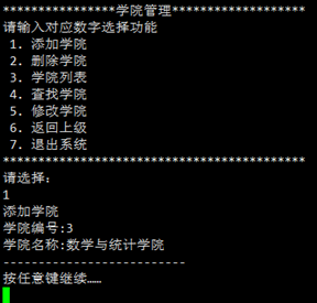 整体分为三个功能模块,分别是学院信息管理、学生信息管理以及成绩信息管理,用户登录后可通过输入相应编号进入不同的功能模块,相应能对各模块的数据功能进行增删改查操作,且能将操作永久存储至系统磁盘。