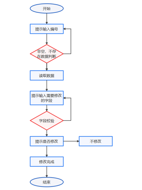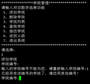 相对较为复杂的是修改学院,因为其涉及判断输入编号以及字段是否为空、以及输入字段不存在等相关校验信息,且修改时可能还会涉及多表修改,具体代码为: